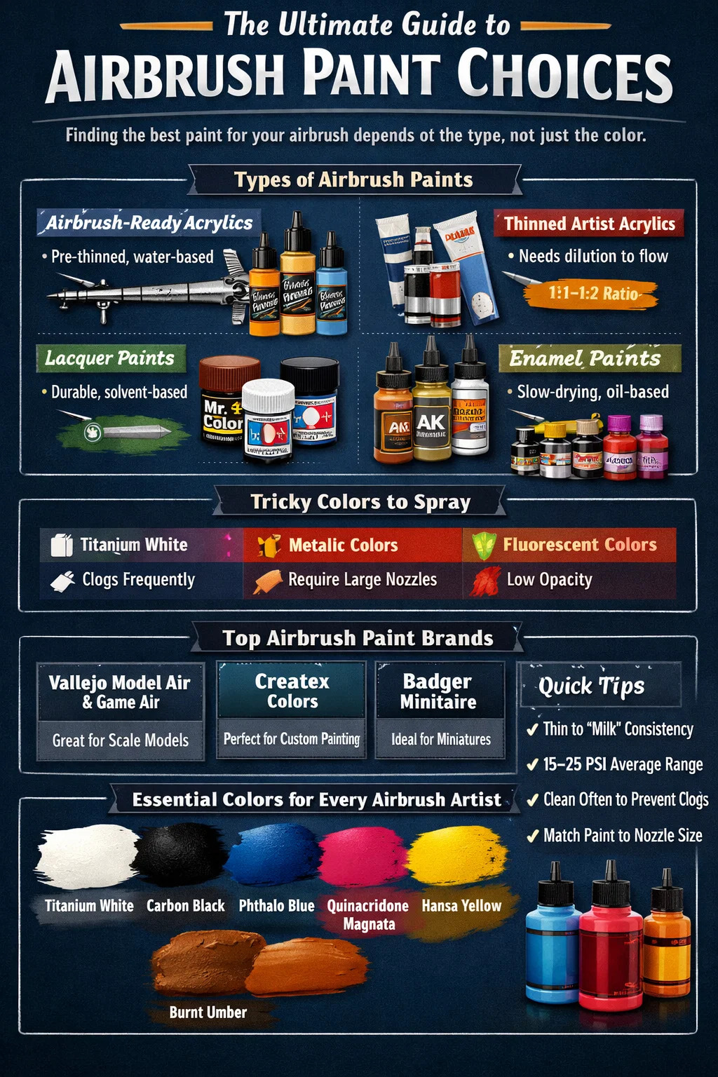 আপনি যদি কোন পথচলা ছাড়া সরাসরি উত্তর চান- এয়ারব্রাশ-প্রস্তুত এক্রাইলিক পেইন্টগুলি বেশিরভাগ এয়ারব্রাশ ব্যবহারকারীদের জন্য সর্বোত্তম পছন্দ আপনি স্কেল মডেল, কাস্টম স্নিকার্স, কেক আর্ট, বডি পেইন্টিং বা ফাইন আর্ট ক্যানভাসে পেইন্টিং করছেন কিনা। এগুলি জল-ভিত্তিক, অ-বিষাক্ত, দ্রুত-শুকানো, এবং আটকানো ছাড়াই এয়ারব্রাশের অগ্রভাগের মধ্য দিয়ে প্রবাহিত করার জন্য যথেষ্ট সূক্ষ্ম রঙ্গক কণা দিয়ে তৈরি। Vallejo, Createx, এবং Bager Minitaire-এর মতো ব্র্যান্ডগুলি সঙ্গত কারণে এই বিভাগে নেতৃত্ব দেয়।