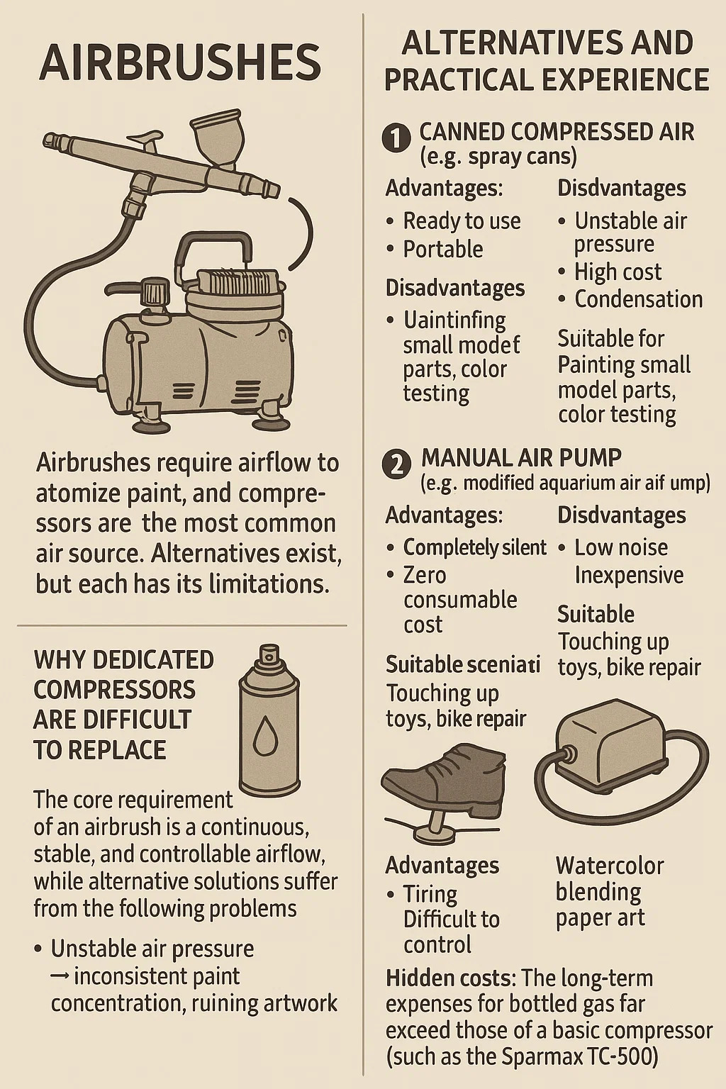 একটি এয়ারব্রাশের মূল প্রয়োজনীয়তা হল একটি অবিচ্ছিন্ন, স্থিতিশীল এবং নিয়ন্ত্রণযোগ্য বায়ুপ্রবাহ, যখন বিকল্প সমাধানগুলি নিম্নলিখিত সমস্যার সম্মুখীন হয়: