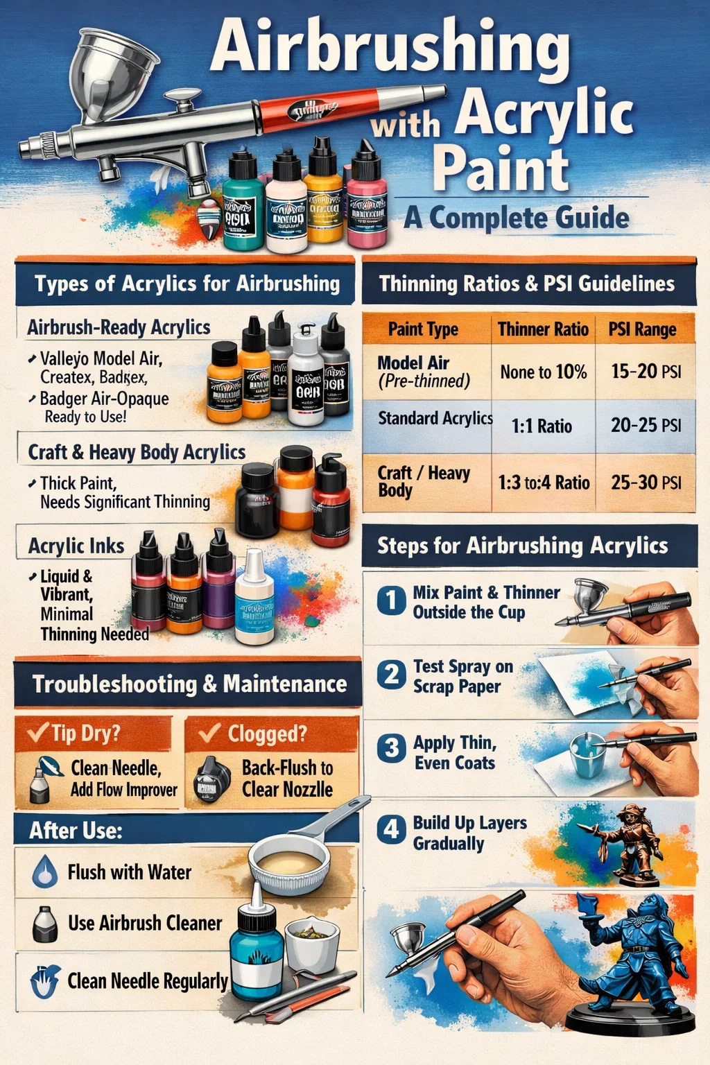 ব্যবহার করে পাতিত জল মৌলিক পাতলা জন্য গ্রহণযোগ্য, কিন্তু একটি উত্সর্গীকৃত এয়ারব্রাশ পাতলা উচ্চতর হয় এই থিনারগুলিতে "ফ্লো ইম্প্রুভার" এবং "রিটার্ডার" থাকে যা শুকানোর সময়কে ধীর করে দেয়। এটি অত্যাবশ্যক কারণ অ্যাক্রিলিক্স বাষ্পীভবন দ্বারা শুকিয়ে যায়; রিটার্ডার ছাড়াই, পেইন্টটি এয়ারব্রাশ ছেড়ে যাওয়ার আগেই সূঁচের ডগায় শুকিয়ে যেতে পারে, এটি একটি ঘটনা হিসাবে পরিচিত "টিপ শুকনো।"