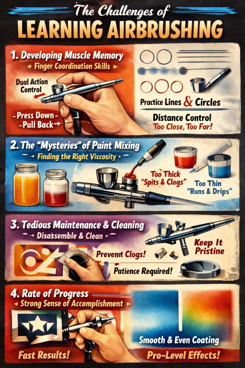 এখানে এয়ারব্রাশিং শেখার অসুবিধা সম্পর্কিত কিছু ব্যবহারিক দিক রয়েছে: