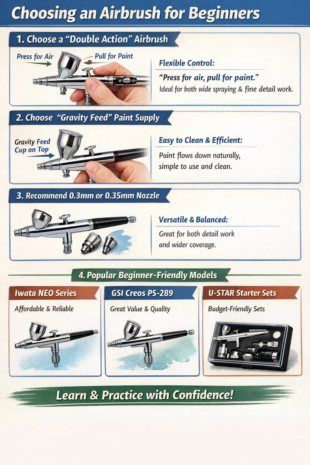 নতুনদের জন্য একটি এয়ারব্রাশ বেছে নেওয়ার জন্য এখানে কিছু ব্যবহারিক টিপস রয়েছে: